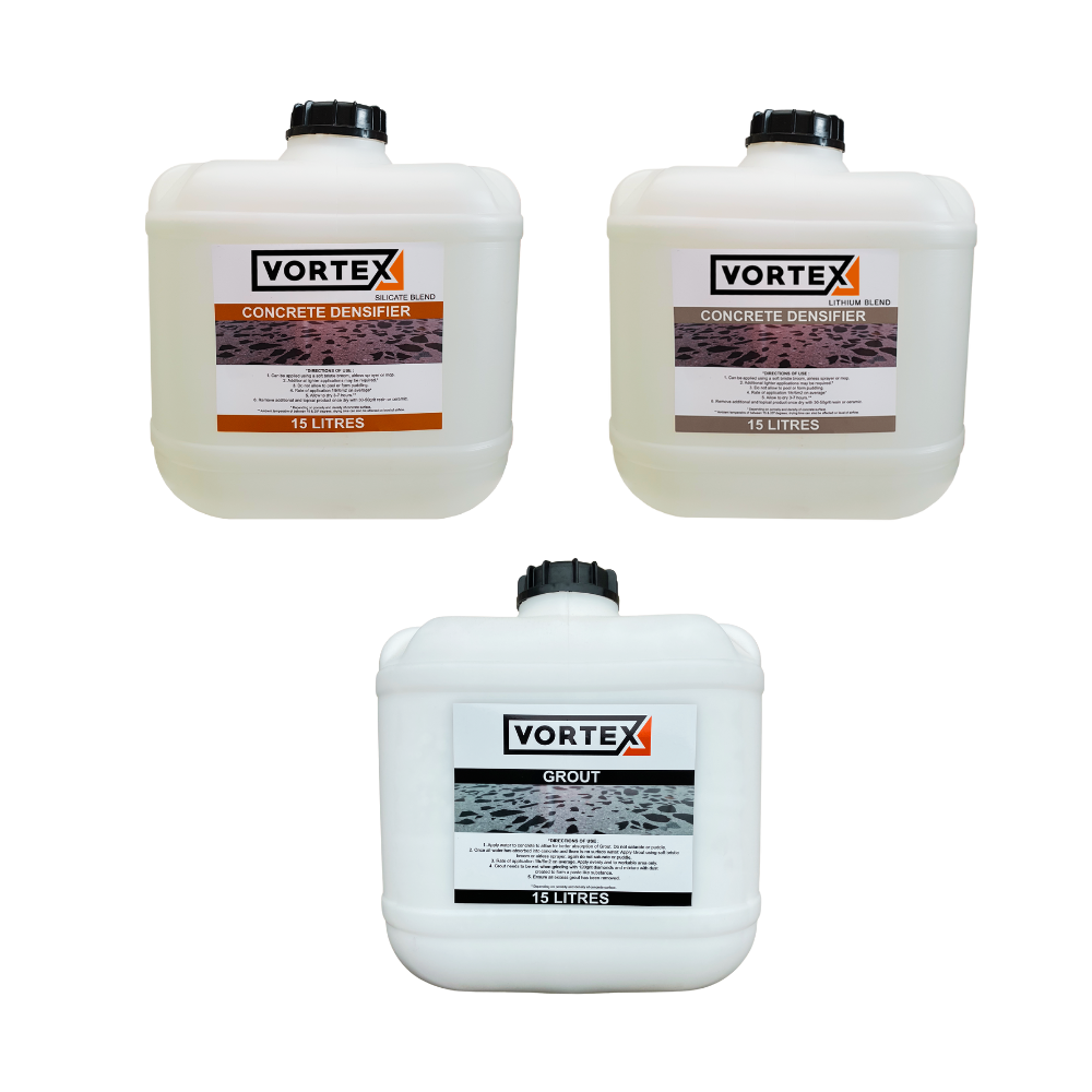 | FLOOR TREATMENT PRODUCTS | VORTEX CONCRETE DENSIFIER, SILICATE BLEND, 15LT, VORTEX CONCRETE DENSIFIER, LITHIUM BLEND, 15LT, VORTEX CONCRETE GROUT MIX, 15LT, FORTIS PREMIUM ENHANCE, 5LT |
